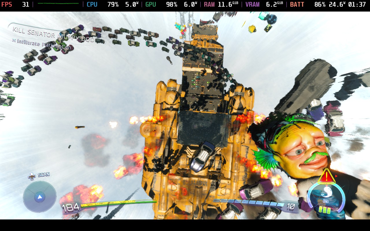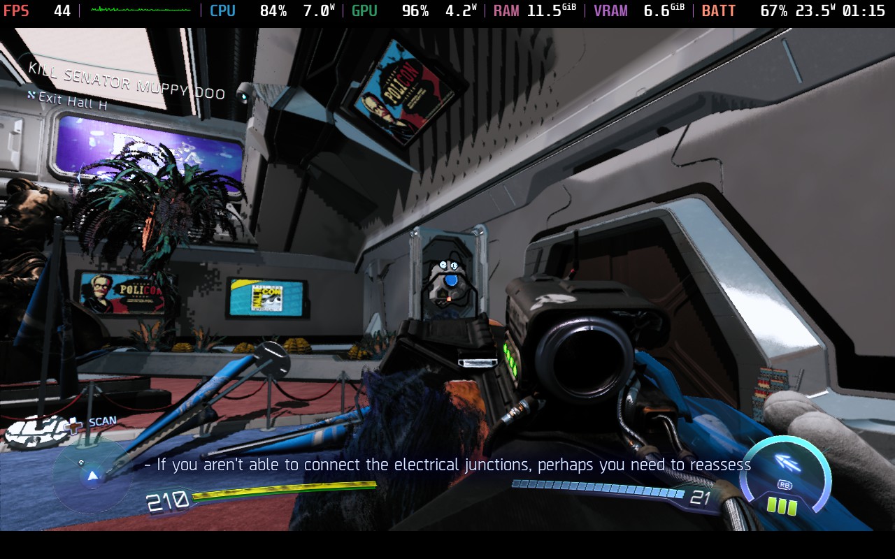 The game defaults to the near-lowest settings, with only Global Illumination set to High, and FSR 3 upscaling on Ultra Performance, and it just barely sticks to 30 FPS during combat. The game looks okay, though the upscaling does make it look more pixelated than I would have liked. This can drop a lot further when skating around Circuit Arcadia or other open areas, staying consistently below 30 FPS.