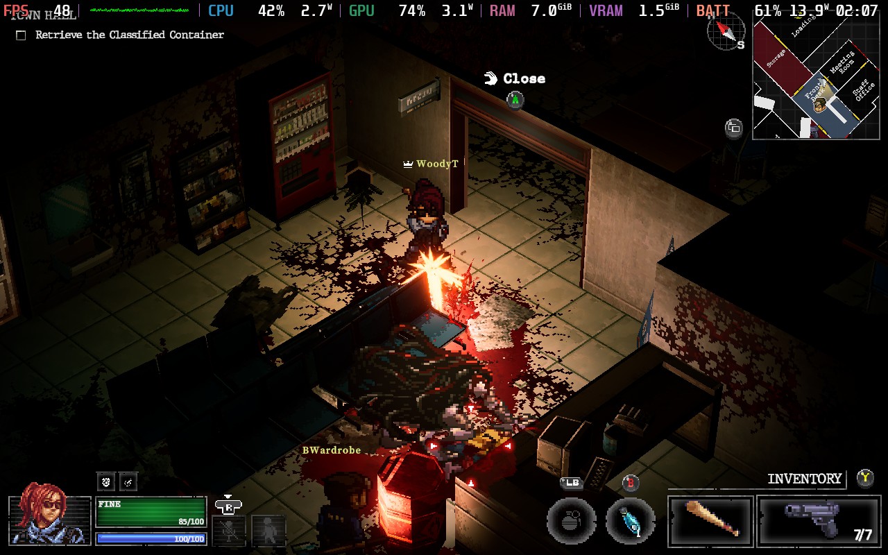 However, the roguelike mechanics make the game stand out to me. As you run through a mission, you will pick up guns, ammo, and crafting materials, and completing a mission gets you a skill point. Once back at base, you will choose your next mission and can go to the crafting bench to create equipment and upgrade your stats. There are ways to increase how much you can carry and how much health and stamina you have. Skill Points can be used to get new skills, unlocking the ability to craft weapon mods, craft new melee weapons and guns, and further strengthen your stats. There are three options for skill points, and after choosing, you will get to choose from 1 of 3 random options, similar to the class choices when the run begins.