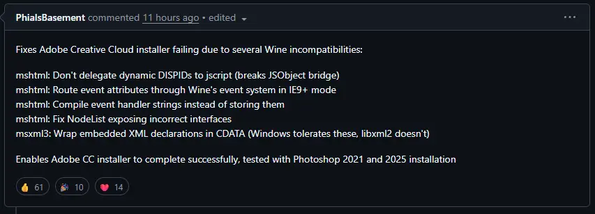 PhialsBasement has been working on the fix, and apparently, their work has enabled them to get the Creative Cloud installer working to completion, tested with Photoshop 2021 and 2025, arguably the most popular Adobe software out there.