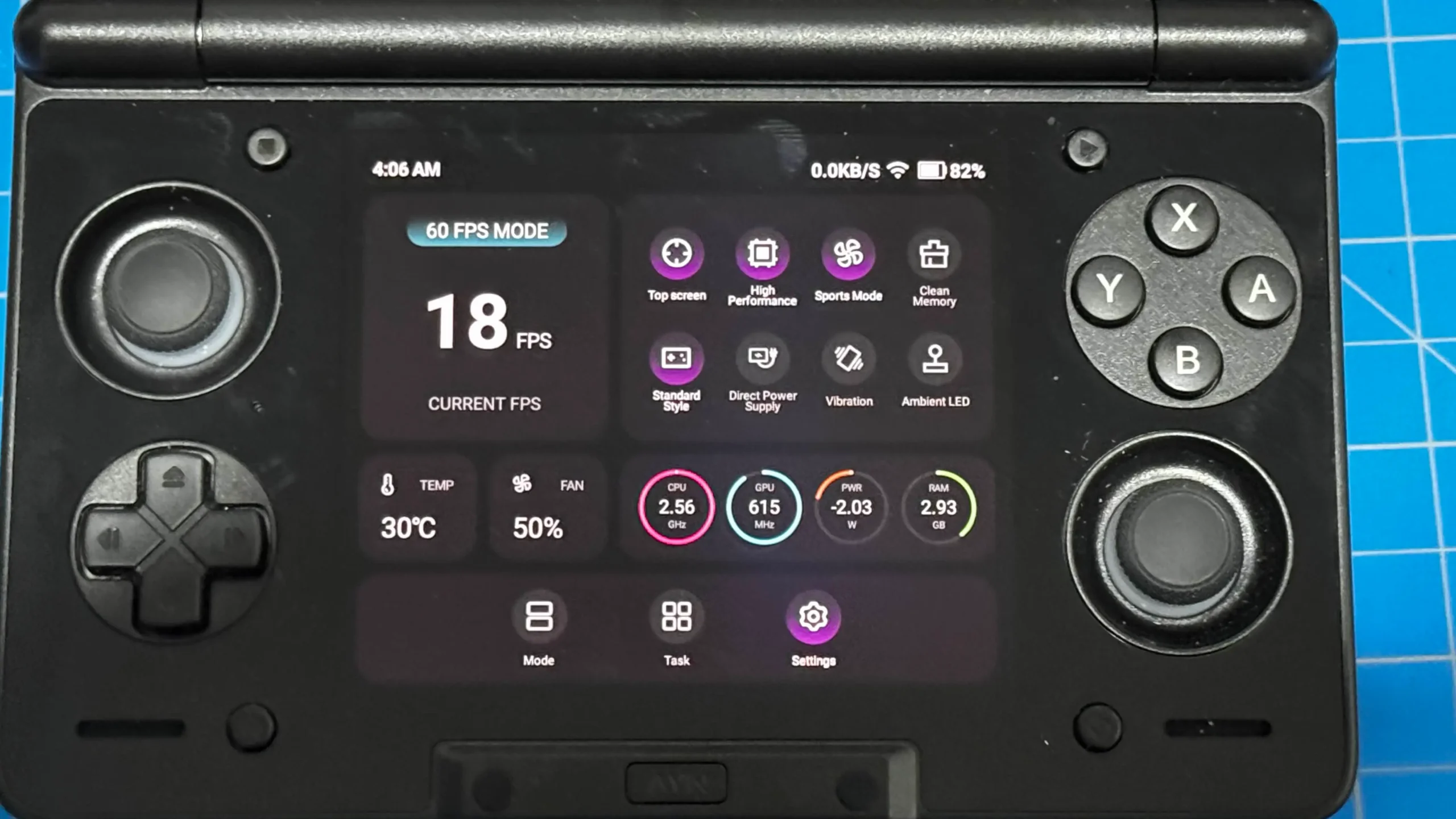 However, the Thor’s quick settings are phenomenal. We can bring them up with the press of the AYN button at the bottom of the bottom screen, and bring with it some fantastic options. On the technical side, we can change the performance mode, forcing the device to use the max GPU power for extra stability in games, change fan speed, toggle vibration, and turn on the joystick LEDs. We can also clean up the memory whenever we want to, check the stats of the device (CPU, GPU, RAM, Power usage), and change the brightness and audio levels for both the top and bottom screens individually.