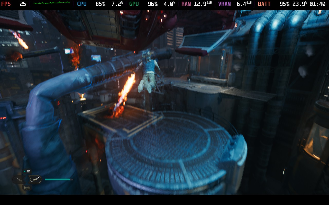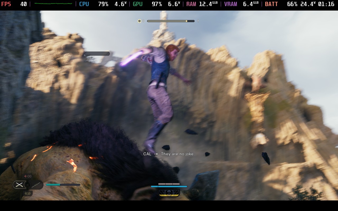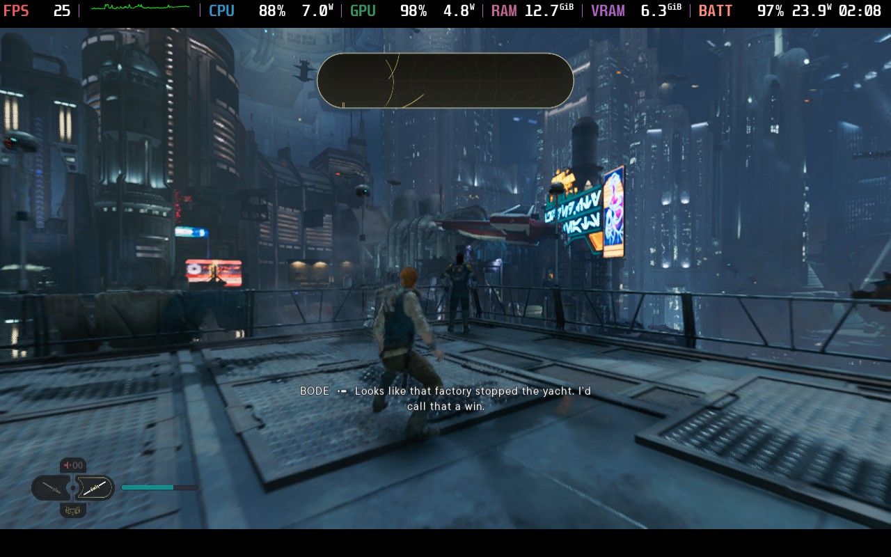 The two areas mentioned here all stayed above 30, very minor loading stutters aside. However, the planet drastically opens up into a massive field area, and certain spots would not break 25, even at a standstill, max TDP, and FSR Performance (FSR UP looked too blurry to be worth the gain imo). This seems to be the same troublesome area featured in the DF videos.